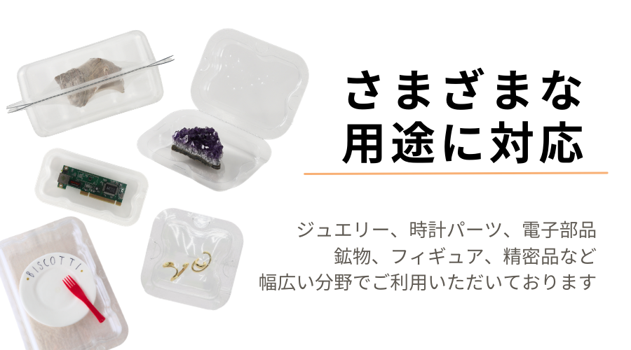 真空成型プラスチックケースとウレタンフィルムが融合した新しいタイプの緩衝材付きケースです。透明素材のため、製品を梱包したまま内部の状況が確認できます。また容器タイプなので繰り返し使用が可能な上、ウレタンフィルムが緩衝材になり、他の緩衝材が必要ありません。「梱包―輸送―保管」全てに優れた画期的なパッケージです。